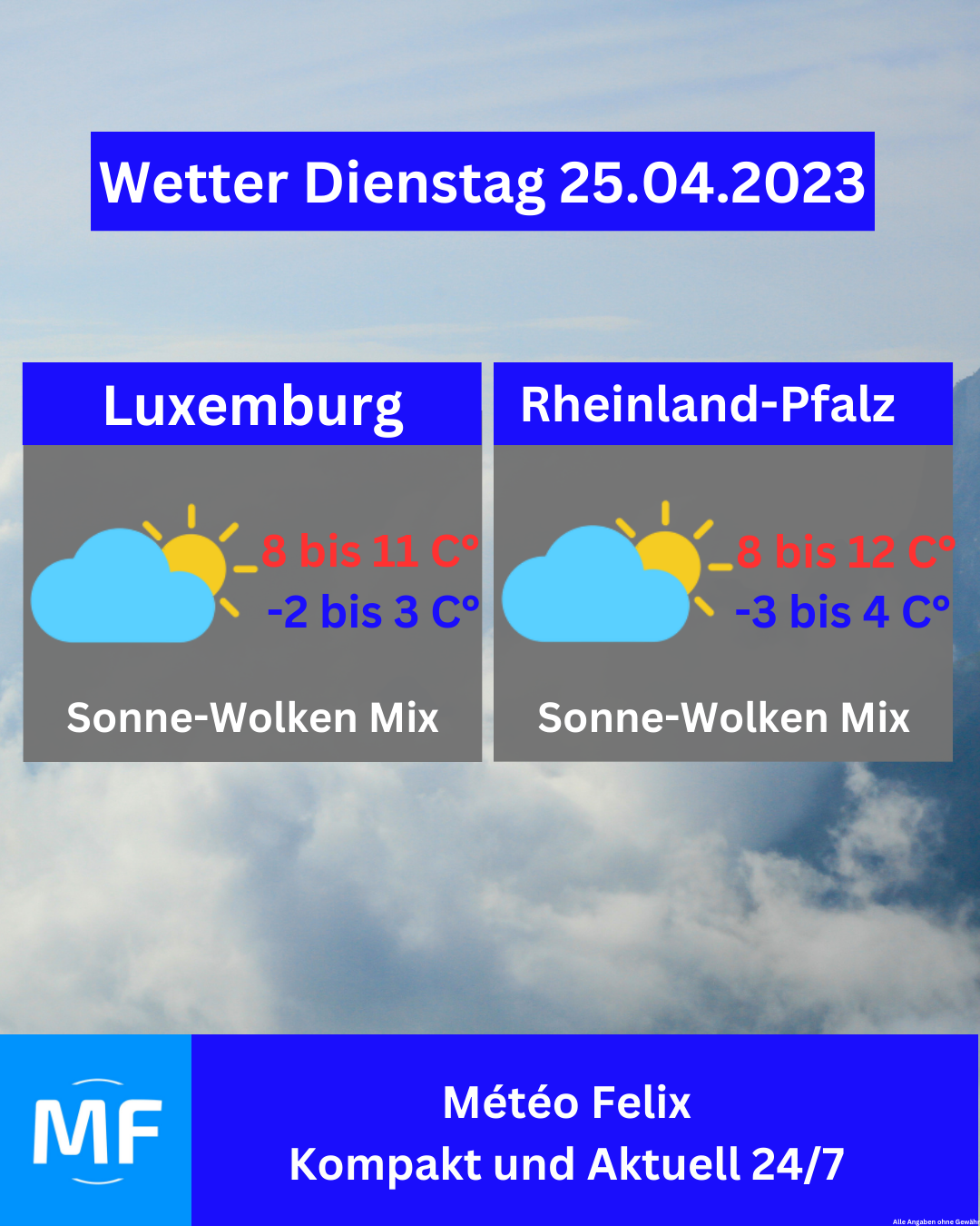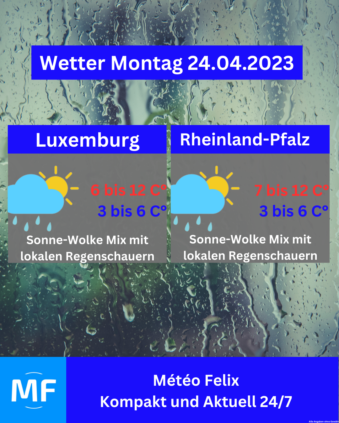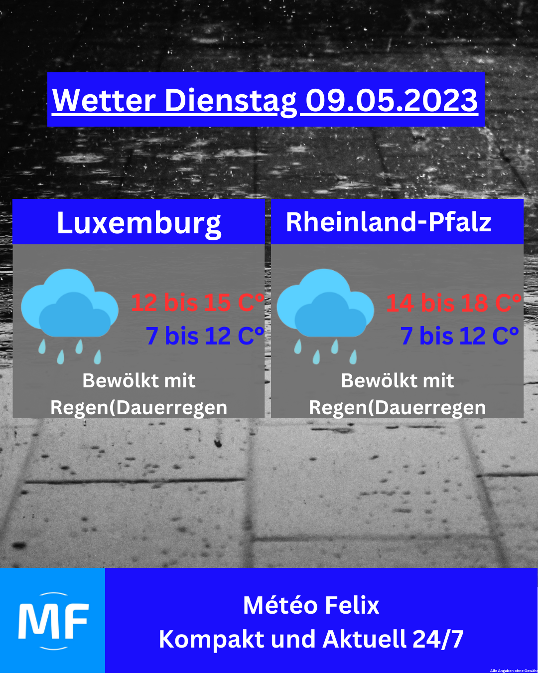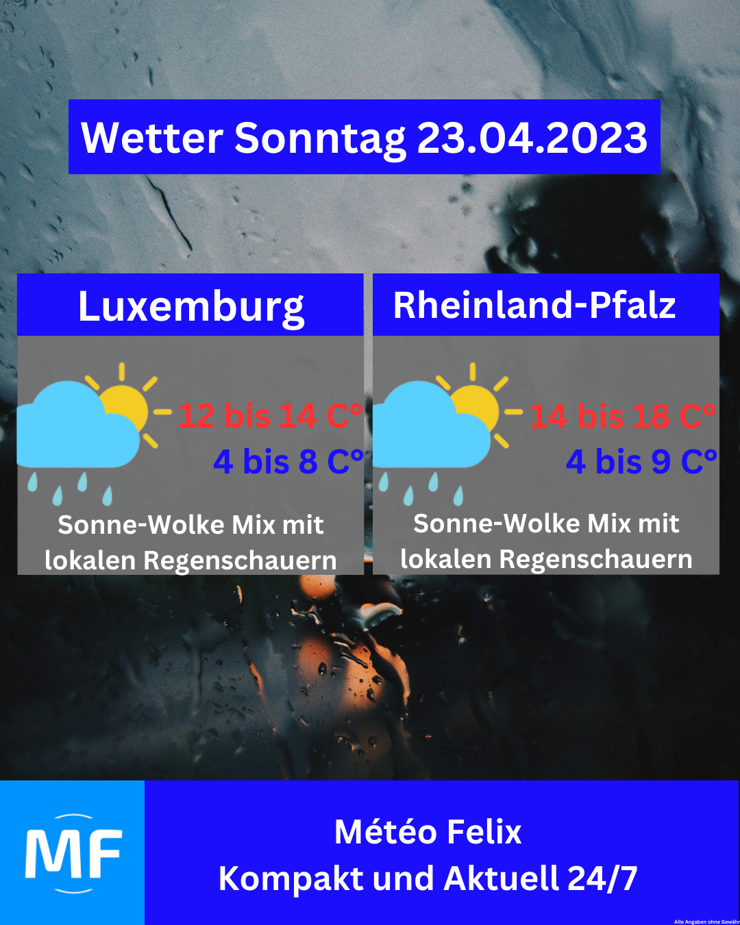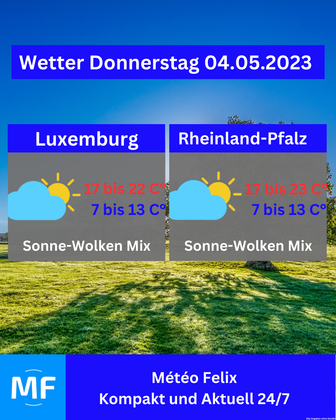 Am Donnerstag erwartet uns ein Sonne-Wolke Mix mit lokalen Regenschauern🌦. Die Temperaturen sind im milden Bereich, 12 bis 15 Grad in Luxemburg und 13 bis 17 Grad in Rheinland-Pfalz.
